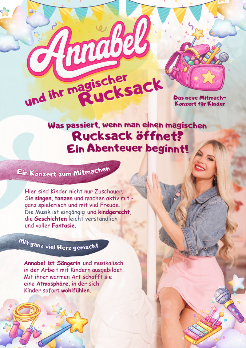 In ihrem magischen Rucksack stecken geheimnisvolle Dinge, bunte Requisiten und kleine Wunder, die jedes Konzert zu einem echten Erlebnis machen. Mit ihrer warmen Art, viel Humor und ihren einprägsamen Songs zieht Annabel Kinder sofort in ihren Bann. Es wird gesungen, getanzt, gelacht – und gestaunt, wenn der magische Rucksack das nächste Abenteuer enthüllt.